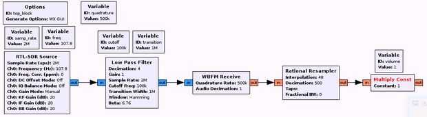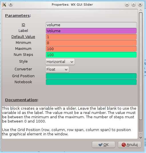 Que dos tareas puede hacerse mediante el uso racional remuestreador y const bloques se multiplican. La primera puede encontrarse en el menú resamplers y el segundo es en la categoría de operadores de matemáticas. Primero tenemos que convertir tasa de 500k a 48k, así que tenemos que diezmar por 500 y luego multiplicar por 48. En el segundo bloque hemos creado const. 'volumen'. Ahora podemos crear elemento variable o lugar denominado "WX GUI Slider". Colocar el segundo de ellos se nos permiten regulación volumen en GUI que aparecerá después de que nuestro programa se inicia. Esto se puede hacer por supuesto con cualquier otra variable.