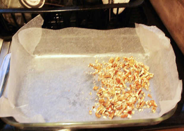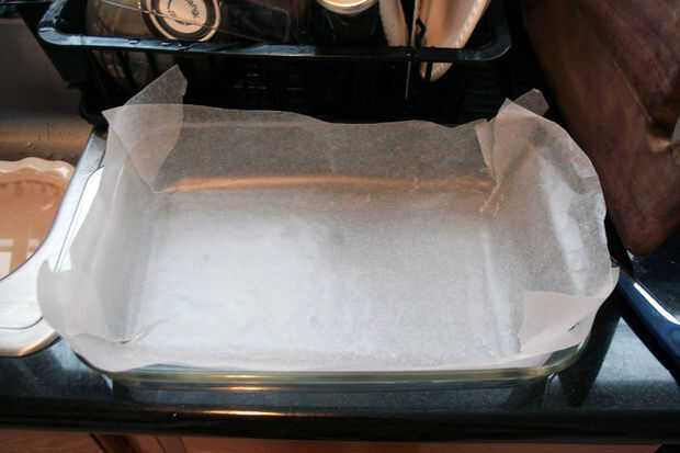 Aplicación a la bandeja antes de agregar el papel ayuda a mantenerlo resbale alrededor mientras está vertiendo en la mezcla de caramelo caliente.