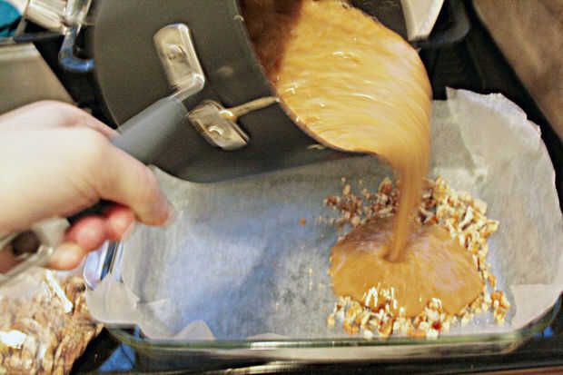También quisiera añadir una pizca de sal en este punto porque me encanta Salado + dulce. Si está añadiendo las tuercas a toda la masa, mezclar en ahora también.