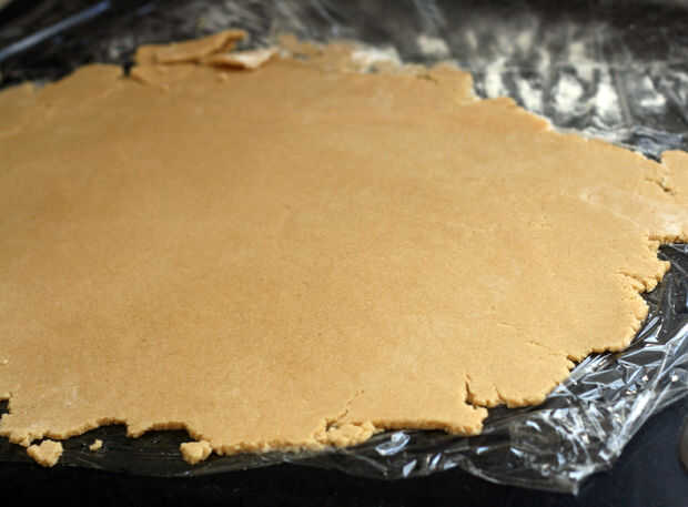 Coloque una hoja de envoltura se aferra a un espacio despejado. Coloque la masa sobre la película y otra hoja de film transparente en la parte superior. Porque encontré la masa a ser tan seco, esto fue lo único que podía mantener juntos mientras rueda hacia fuera. Rodillo la masa enfriada en un escaso 1/8" espesor (recuerda cómo fino las galletas poco!).