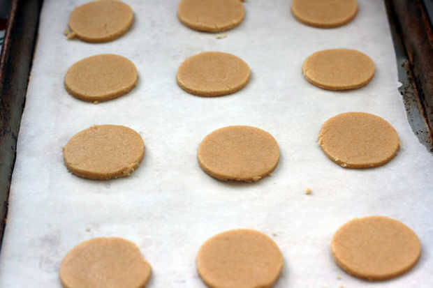 La tubería a algún tipo de diseño encima de cada galleta. Cuatro líneas verticales y varios hashes horizontales, dará la impresión de una mantequilla de Nutter, pero cualquier diseño a hacer.