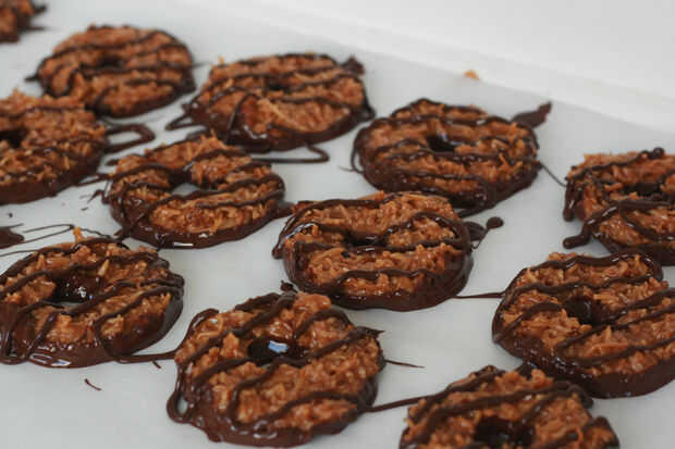 mejor que lo real, esta receta de Girl Scout Samoas (-galleta estilo) ganará los corazones de todos los que participan. Estas galletas toman un poco de tiempo, pero si lo tiene, usted encontrará el proceso gozosa y gratificante. La mejor parte es que esta receta es un riff en la receta tradicional de tréboles - así que encima de un doble lote de galletas y eres bueno para ir!