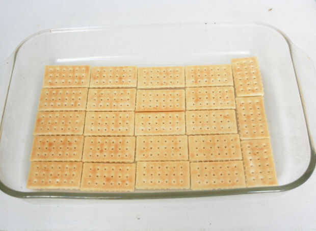 Rocíe la cacerola más pequeña con aceite de cocina y poner galletas de borde a borde, a lo largo de la parte inferior.