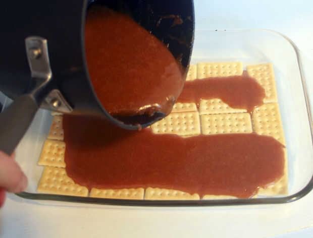 Verter alrededor de la mitad del relleno sobre la capa de galletas.