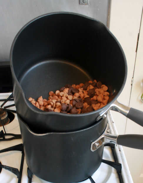Se funden las virutas en un baño María (o microondas) hasta todo suave y cremosa. Tengo una caldera doble, y tiendo a botch derretir chocolate en el microondas, así que utilicé una cacerola Coloque arriba otra sartén con un poco de agua hirviendo en la bandeja inferior.