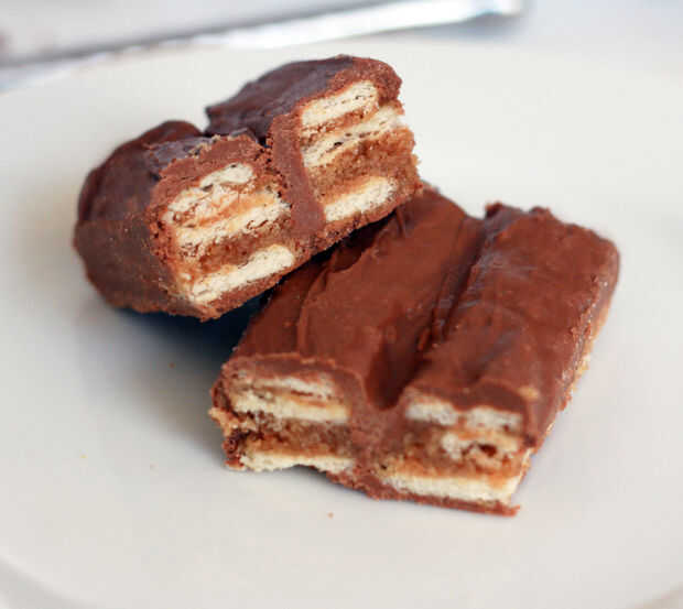Las barras en otra capa de chocolate, asegurándose de cubrir la parte superior y los lados de la capa.