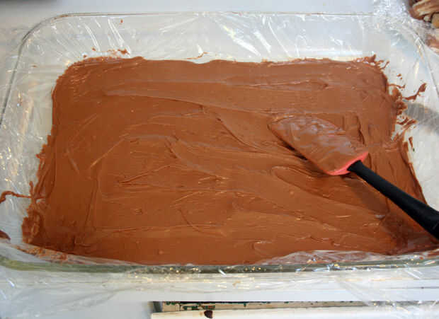 Cubrir una fuente para horno grande en envoltura de plástico. Vierta una capa de chocolate y permiten establecer.