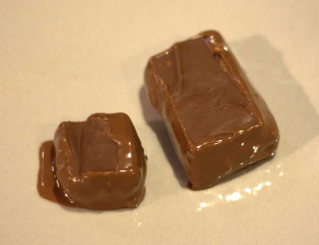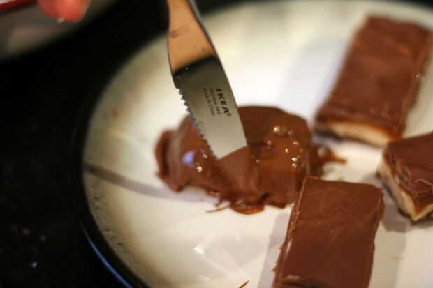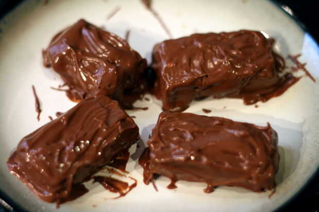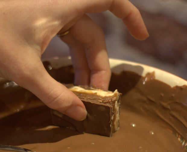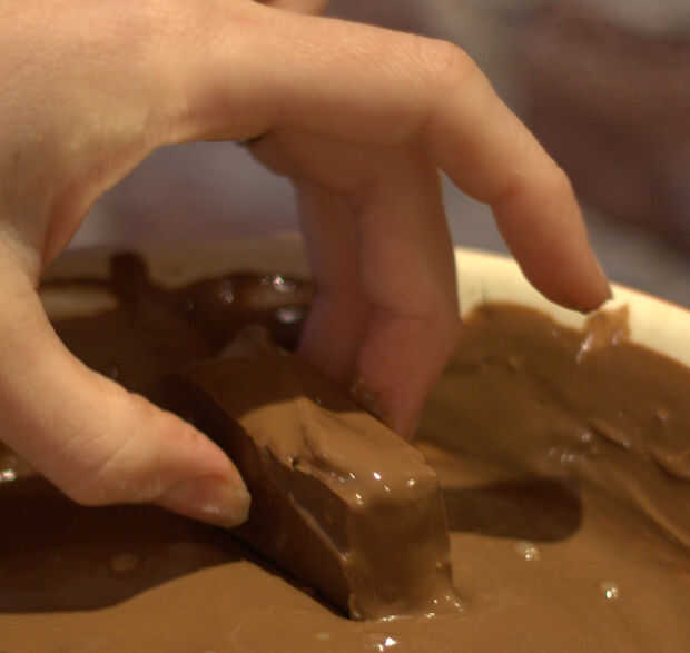 -Coge un cuadrado (o rectángulo) del bloque de barra de caramelo y sumergir cada borde en la mezcla de chocolate derretida.