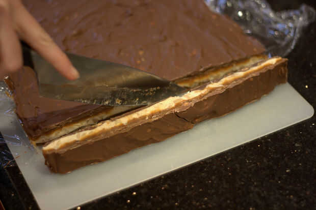 -Corte tiras a través de su bloque. Estos deben ser el ancho de las barras de Snickers acabados deseado. Te recomiendo unos 2cm, o en algún lugar entre 3/4"- 1".