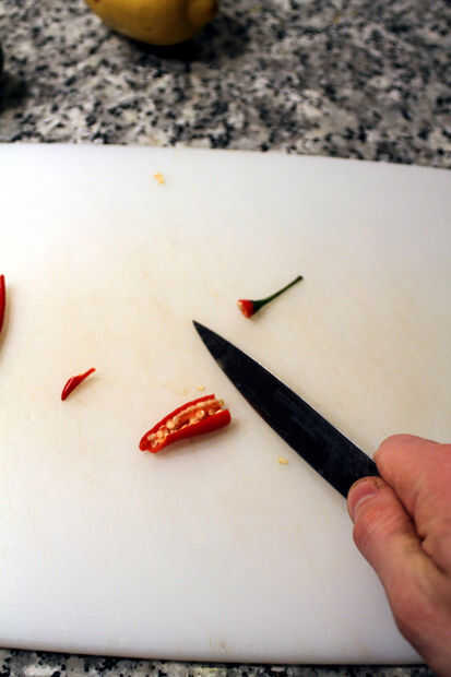 Quitar las semillas de pimientos de ojo de pájaro y picarlos finamente.