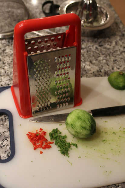 Vierta la crema en una cacerola y agregar los pimientos picados y la mitad de la ralladura de Lima.