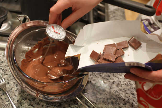 Traer el chocolate hasta 48 grados centígrados para el chocolate oscuro o 45 grados para chocolate con leche, luego retire del fuego y añadir el chocolate reservado (unmelted).