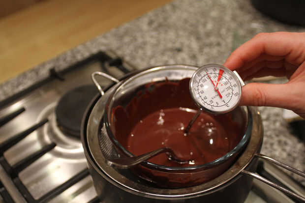 Ahora vas a tener que atemperar el chocolate. Las instrucciones siguientes son un breve resumen de un tutorial más sobre cómo templar el chocolate por scoochmaroo.