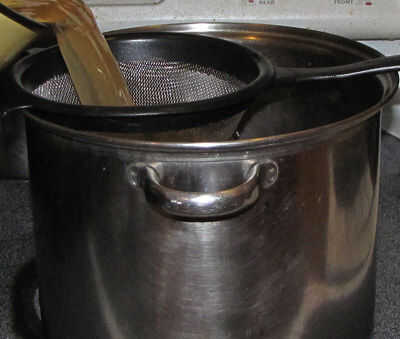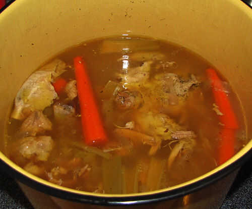 Una vez fría, vierta el caldo a través de un colador de malla fina para eliminar todos los trozos de pollo, apio, huesos, etc..