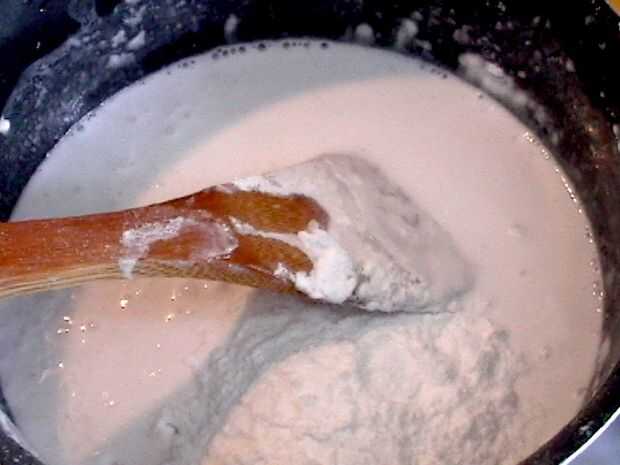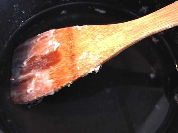 Revolver a fuego muy lento hasta que la mezcla forme primero en un pegajoso pegamento entonces una bola gruesa. (Aprox. 9 minutos)