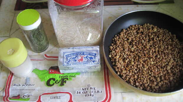 1. 150-200 gramos de arroz de jazmín blanco y la misma cantidad de lentejas regulares (le doy la receta para dos porciones)