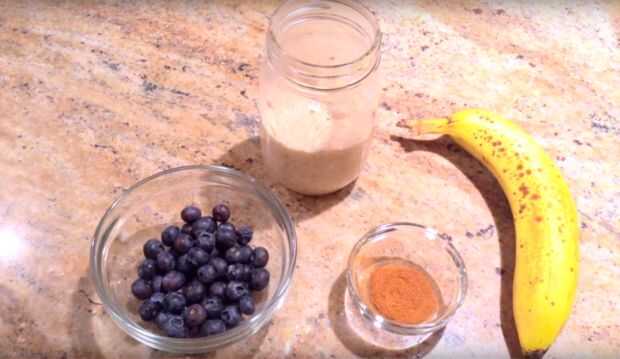 Ahora elegir cualquiera de tus favoritos encabezando combinaciones y añadir en la parte superior. Para hacer el relleno que elegí, simplemente agregue 1/2 plátano en rodajas, 1/4 taza arándanos y algunos canela a la mezcla de avena durante la noche.