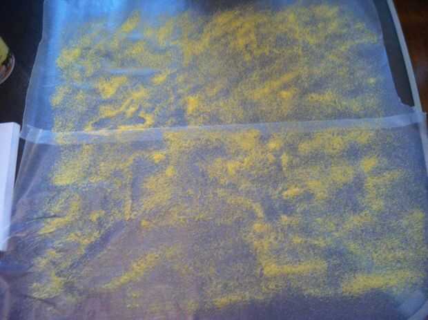 6. una vez que se añade la harina y la masa todavía tiene tiempo para amasar puede cubrir generosamente dos tableros grandes cortes, galletas o superficies cubierta de papel de cera (no recomendadas) con harina de maíz. Si no pones suficiente harina de maíz en la superficie cuando la masa expande lo pegará a la superficie y terminaras hombre manejando sus bagels y aplastar abajo. Utilicé papel de cera en este instructable porque olvidé que era un dolor en el trasero. En la foto puede realmente parecer tenía suficiente medio de maíz, pero los bagels todavía pegan un poco cuando trató de quitar (en paso posterior).