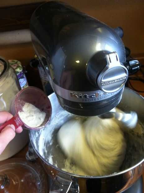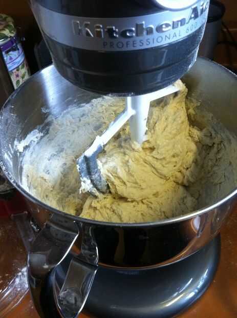 5. con el gancho para masa Unido puso su mezclador a la posición más baja, ajuste un temporizador de 15 minutos y agregue lentamente el pasado 5/8 c. de harina (6 1/8 c. menos 5 1/2 usted ya puesto en).