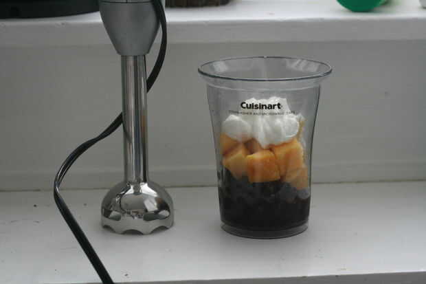 - Fruta -usar fruta congelada porque es fácil de conseguir, fácil de almacenar y congelado en su punto máximo de madurez, para que nunca tenga que preocuparse por lo que se apaga.