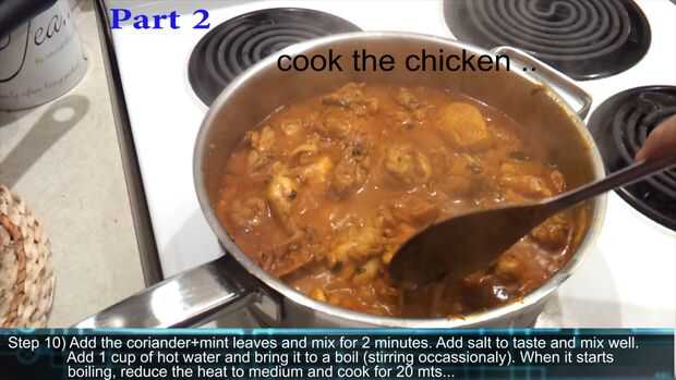 Paso 9) Inmediatamente, añadir los trozos de pollo y mezclar bien para cubrir el pollo con masala. Gire el calor al medio, añadir 1/4 de taza de agua y mezclar durante un minuto.