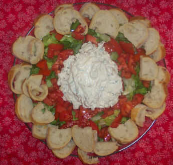 Mezclar los cinco primeros ingredientes. Colocar la lechuga en un plato, luego los tomates, y por último el dip. Cortar la baguette en trozos pequeños y colocar alrededor del borde de la placa de.