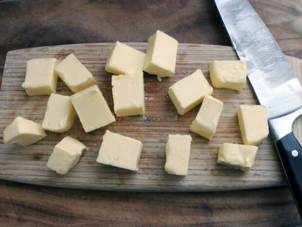 Cortar la mantequilla en trozos pequeños. Mida la leche. Crack los cuatro huevos para la masa en un bol.