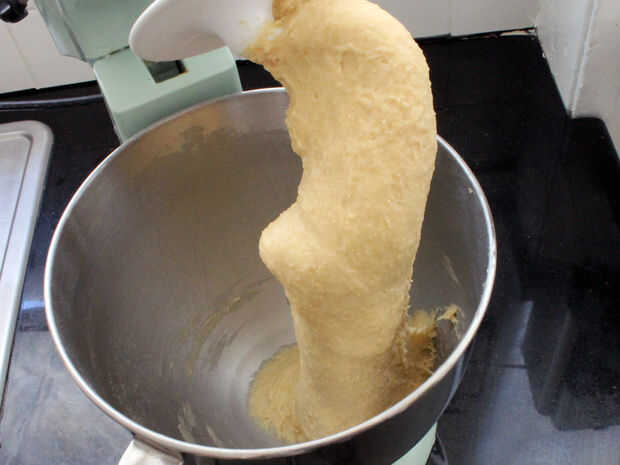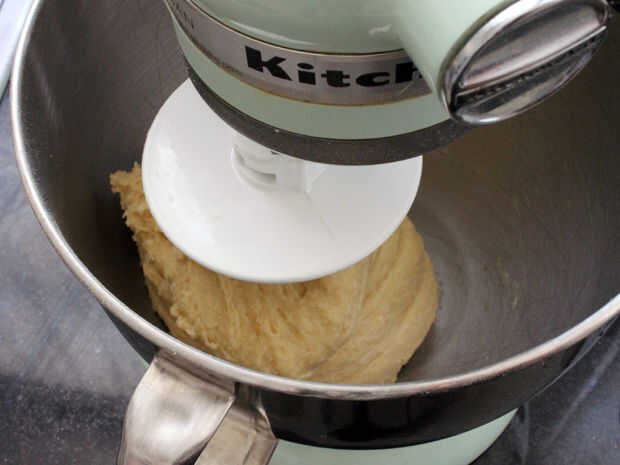 Una vez que se ha incorporado toda la mantequilla, aumentar la velocidad al medio y mezcle durante unos 8 minutos, raspando hacia abajo del tazón de fuente y gancho en medio. Cuando la masa esté lista, comenzará a golpear contra los lados del tazón de fuente. (Asegúrese de que el mezclador está en la posición bloqueada o va a ir tuercas!)