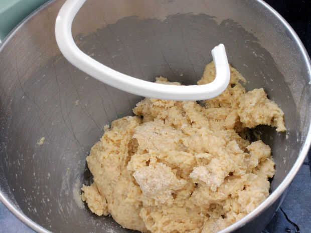Ponga la batidora a velocidad media-baja y empieza a caer en tus piezas de mantequilla, uno por uno, raspando hacia abajo el recipiente y gancho según sea necesario. Si la mantequilla no es agregada lentamente, puede dividir la masa en un lío grasoso.