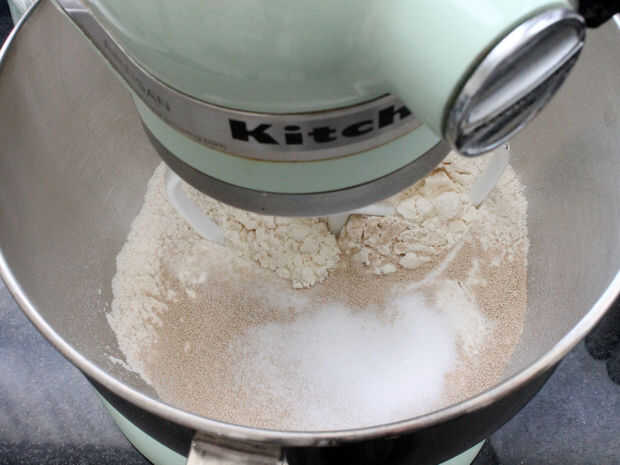 Puede batir a mano los ingredientes secos (harina, azúcar, levadura, sal), o ponerlos en la batidora con el accesorio de paleta.