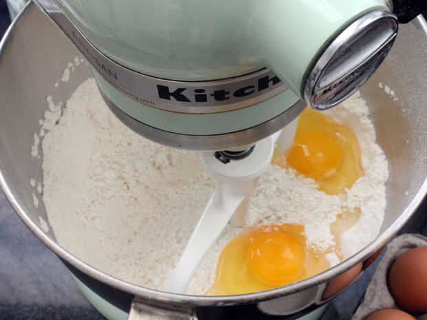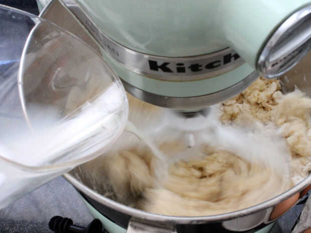Añadir los huevos y encienda su mezclador a baja. En marcha la batidora, añadir la leche. Tan pronto como la mezcla empieza a agruparse, sustituir el accesorio de paleta por el gancho de la masa.