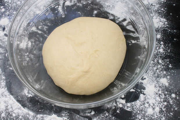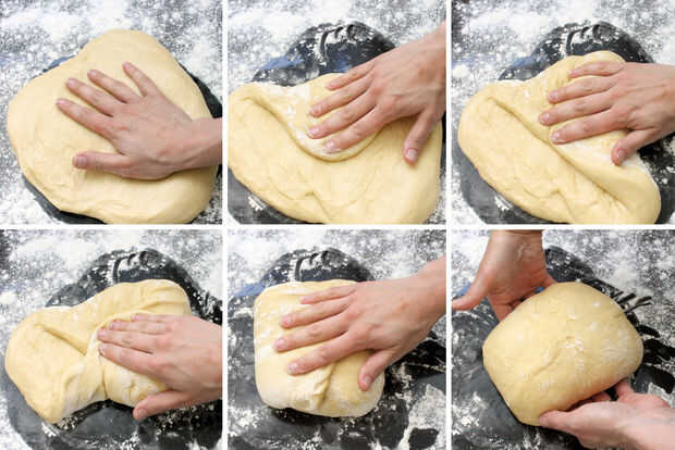 Amasa a mano unas cuantas veces, luego formar una bola doblando los bordes como se muestra (norte, este, sur, oeste). Primicia las manos debajo de la bola. Gire la bola encima y en un recipiente grande con el lado liso en la parte superior. Cúbralos ligeramente con papel plástico y deje reposar en un lugar cálido para aproximadamente una hora.