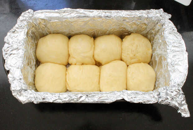 Rodar cada pedazo de masa entre las manos ahuecadas. Si estás haciendo un pan, Coloque ocho bolas en cada uno de los recipientes de pan, y está en el siguiente paso! Para lo bollos del à de tête, siga a lo largo de: