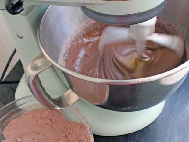 Poco a poco agregue la mezcla de harina y cacao a baja velocidad.