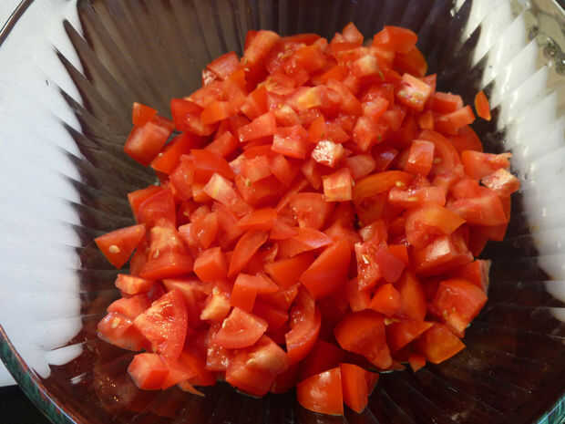 Usando un cuchillo afilado, corte los tomates en cubos lo más pequeños posibles. Yo trato de apuntar un cubos de 1/4" y trato de aplastar o romper los tomates lo más pequeños posible.