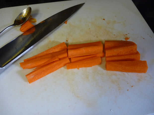 Pelar, cuarto y dividir unas zanahorias grandes. Cortar unos tallos de apio en trozos de tamaño similar como las zanahorias. Colóquelos en la nevera hasta el momento de servir.