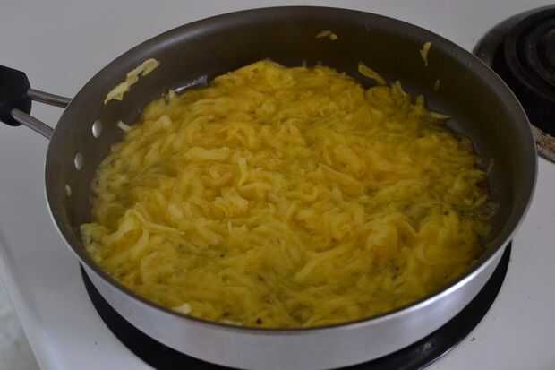 Primero debe lavar y pelar las manzanas. Entonces agarra el rallador y rallar las manzanas. Freír en un poco de aceite hasta llegar algunos la salsa y deje que se empape bien.