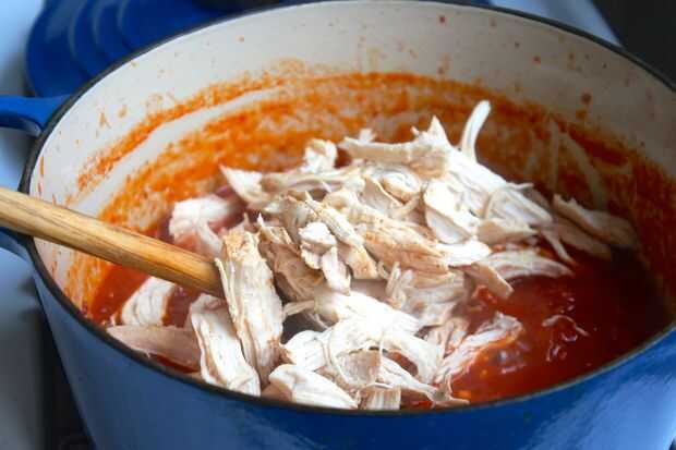 Ahora agregue el pollo cocido y dejar que cocine unos minutos más, o hasta que el pollo se calienta a través de.