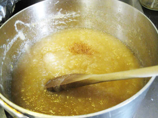 Me pareció que de cuatro Gravensteins, un cuarto taza de azúcar un montón. También añadir ralladura de limón porque me encanta y la canela porque me encanta y nuez moscada recién rallada porque estaba allí.