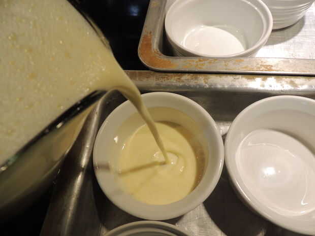 Vierta la mezcla en 6-8 moldes llenado casi a la cima. Coloque los moldes en una bandeja con lados altos y cuidadosamente llene la bandeja con agua caliente hasta la mitad camino hasta los lados de los moldes. Asegúrese de no salpicar agua en el flan.