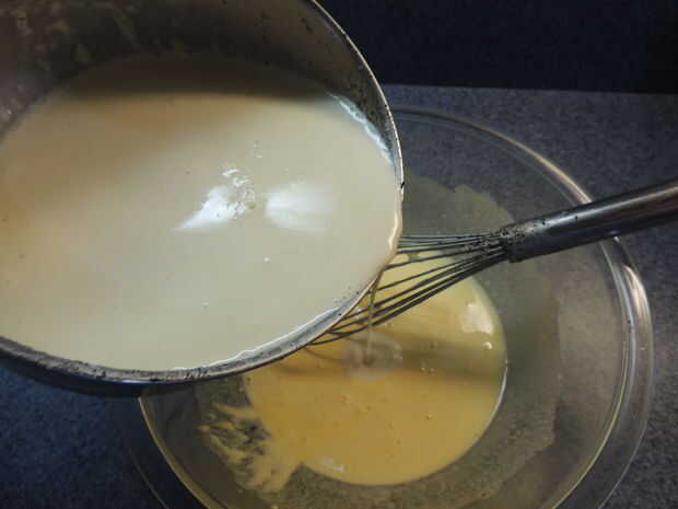 Agregue lentamente un poco nata a los huevos mientras se mezcla. Seguir añadiendo la crema un poco a la vez. Es importante no añadir demasiada crema a la vez o se cocine los huevos y trozos. Una vez que los dos se combinan completamente puede añadir el extracto de vainilla si no usas vainilla en rama.
