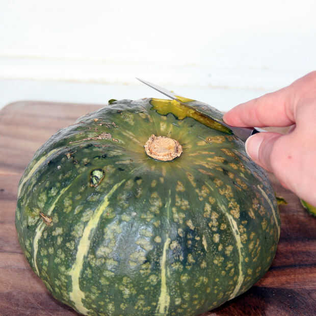 Utilice un cuchillo de cocina para pelar lejos la piel de la calabaza. Mucho más fácil!