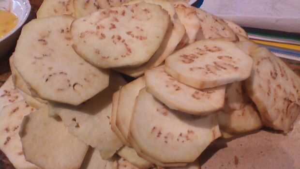 Cortar la berenjena en rodajas como se muestra en la imagen.