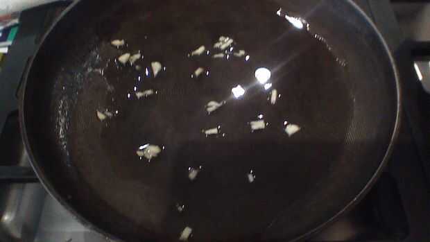 Cortar el ajo y ponerlo en una sartén. Poner suficiente aceite para que cubra el fondo de la olla.