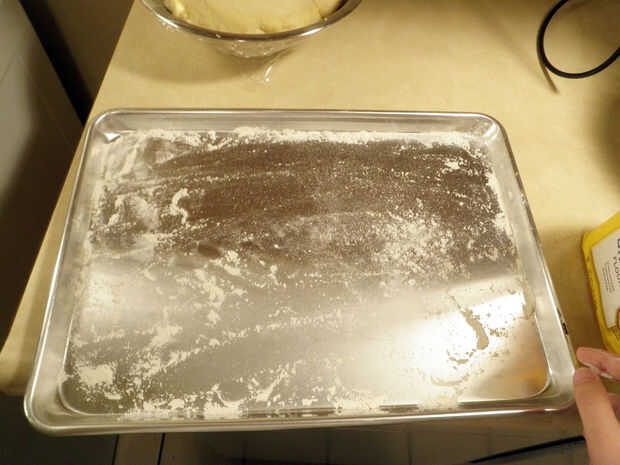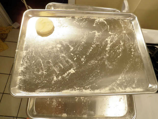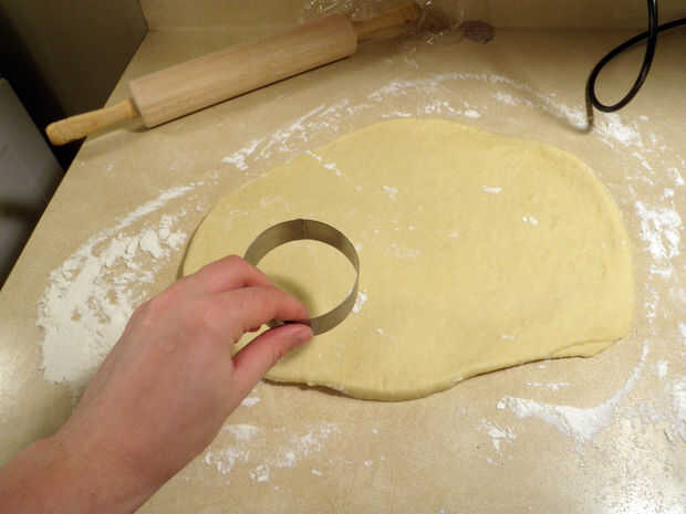 Con un cortador de galletas, corte 3" rondas de la masa aplanada y coloque sobre una charola enharinada.