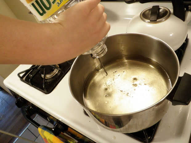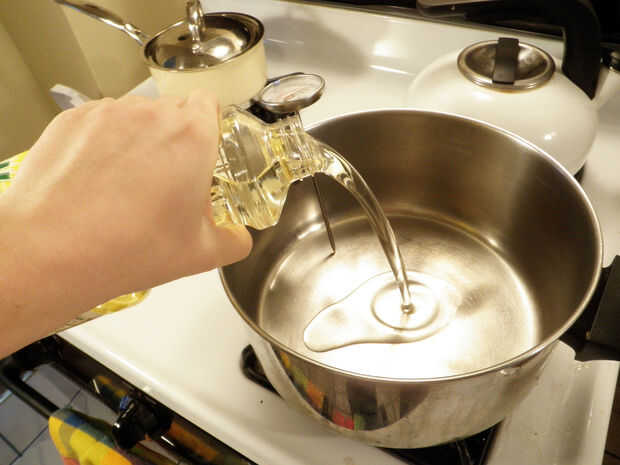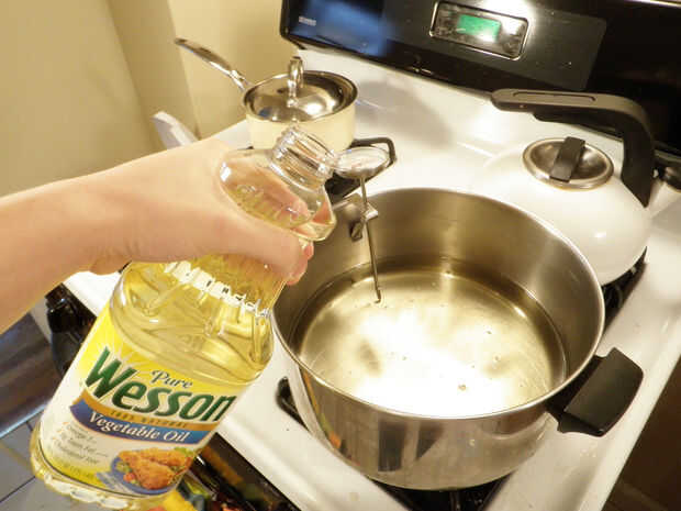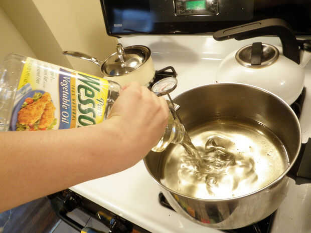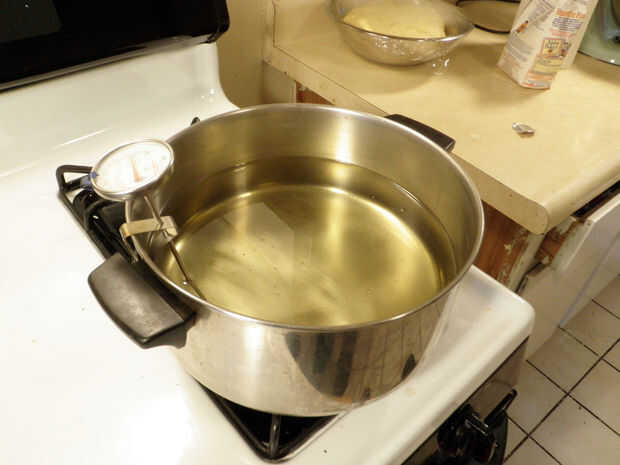 Lo primero es lo primero, llene una olla grande y alto con 2"- 3" de aceite. Coloque un termómetro de caramelo a la olla y poner a fuego medio para que lentamente puede empezar a construir hasta 350 grados. El objetivo es mantener el aceite a 350 grados. Es de 350 grados Fahrenheit. Mantener el aceite a 350 grados.