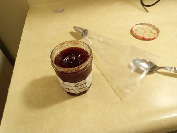 A continuación, vas a querer su jalea de la cuchara en una manga pastelera con una punta de metal de 1/2'. La punta metálica es importante efectivamente, punzante en el buñuelo cocido.