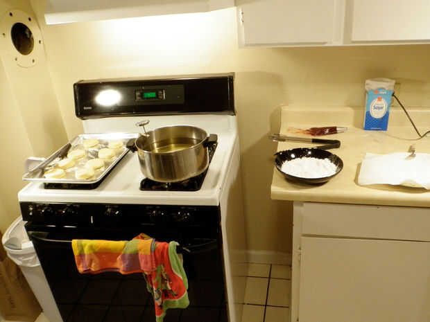 Por último, llene un recipiente con una cantidad generosa de azúcar en polvo. Esto se utilizará para cubrir las donas recién fritas caliente abrasadoras.