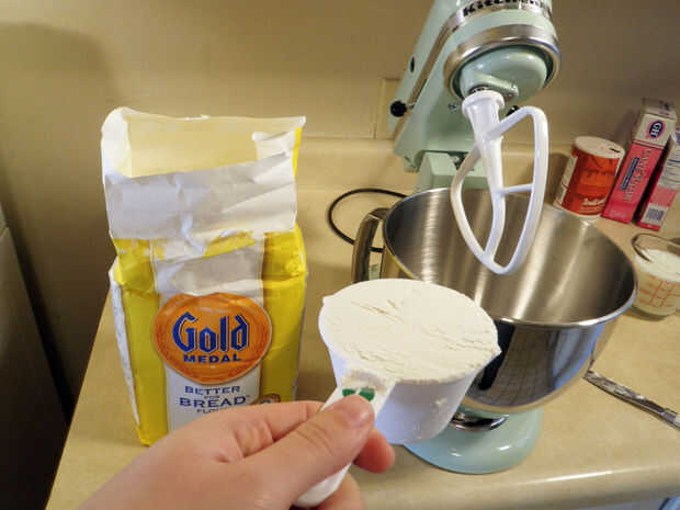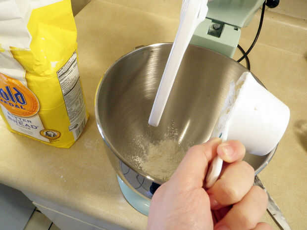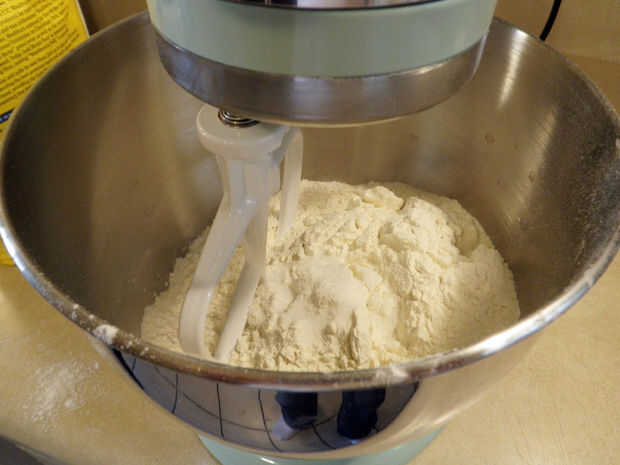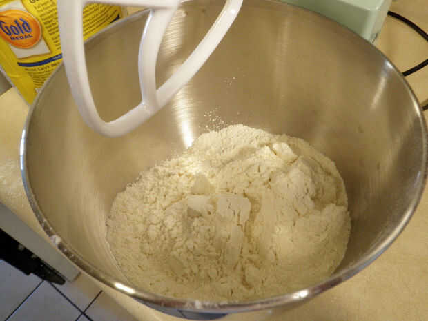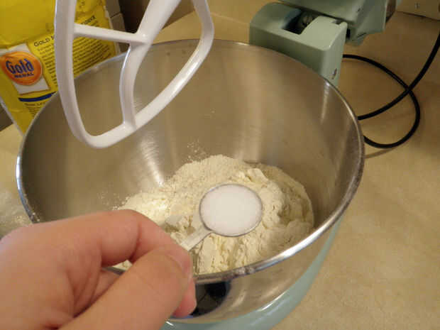 Combine 4 tazas de harina y 1 cucharadita de sal hasta bueno y mixto.