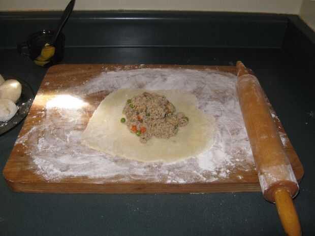 Una vez que la masa es el tamaño correcto lugar tres colmada cucharadas del relleno en el centro de la masa enrollada hacia fuera.